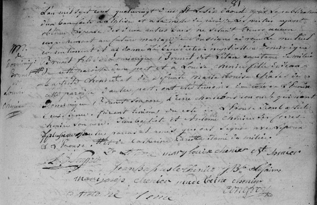 Marie Louise Chénier & Dominique Brunet (dit Letang) marriage in St-Joachim, Pointe-claire
