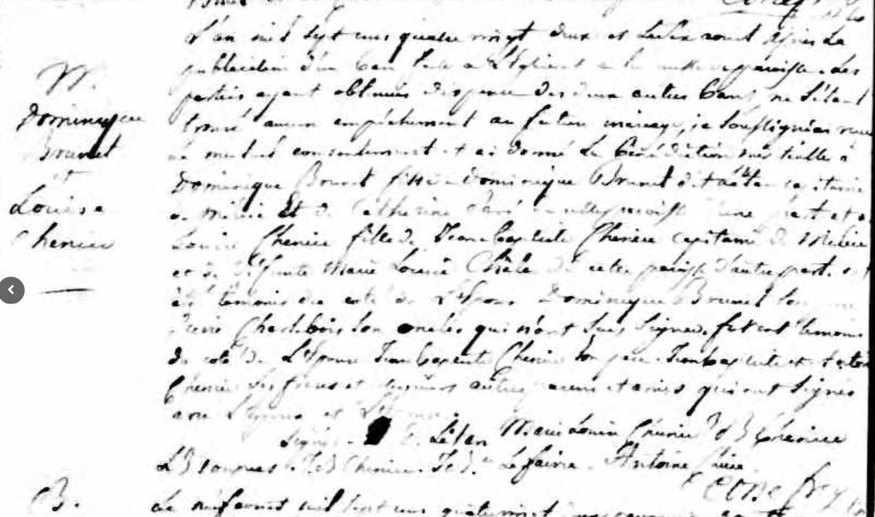Marie Louise Chénier & Dominique Brunet (dit Letang) marriage in Ste-Anne-de-Bellevue