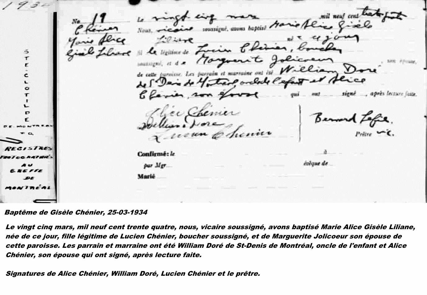 Baptism record for Gisèle Marie Alice Chénier