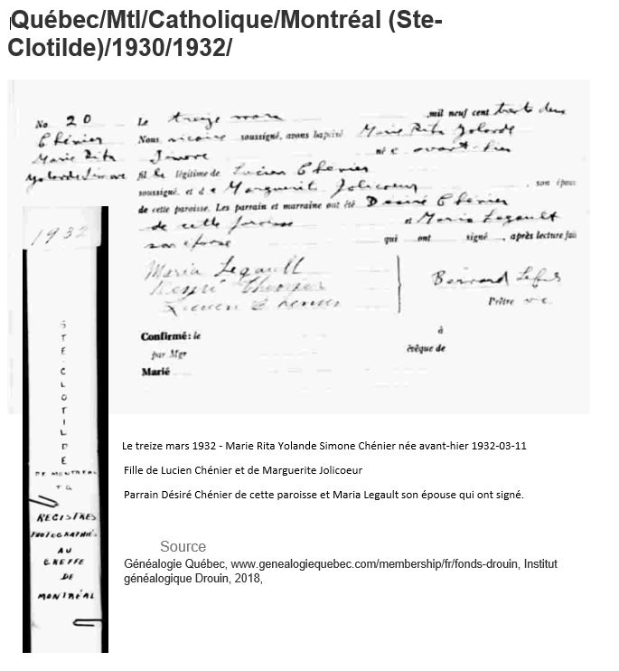 Baptism record for Yolande Marie Rita Yvonne Chénier