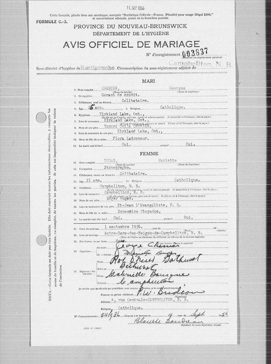 Record de mariage de: Georges Chénier et Mariette Dugas