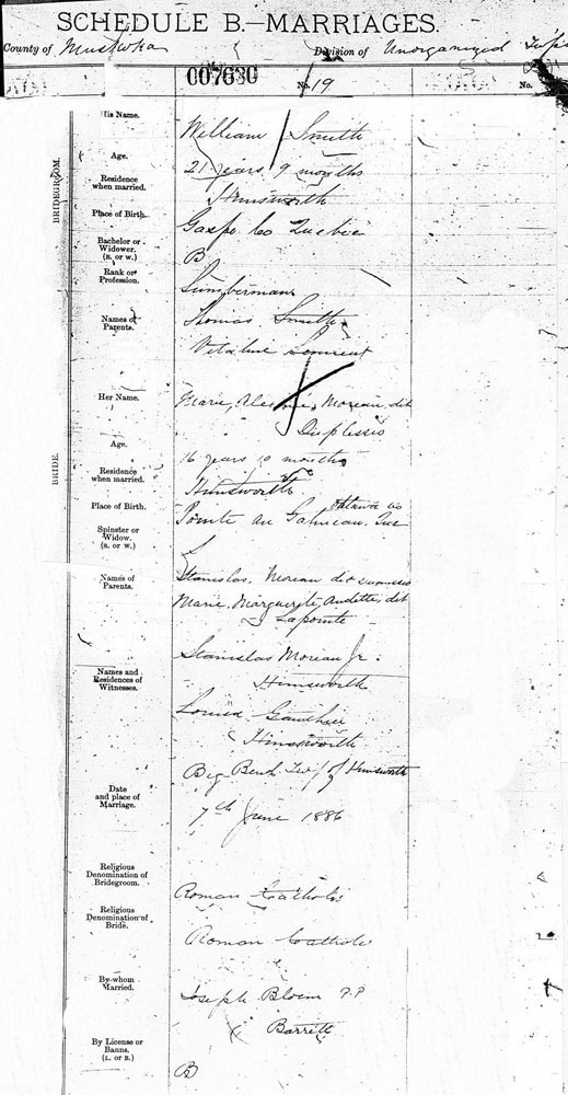 Marriage of William Smith and Marie Alexina Cécilia Moreau dit Duplessis