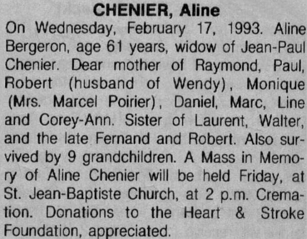 Chénier, Aline (Née Bergeron) (1932-1993)