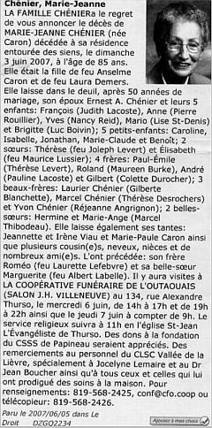 Chénier, Marie Jeanne (Née Caron) (1922-2007)