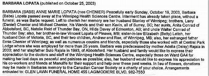 Lopata, Barbara (Babs) Anne Marie (Née Chénier) (?-2003)