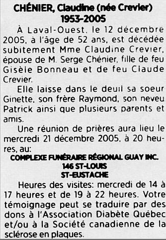 Chénier, Claudine (Née Crevier) (1953-2005)