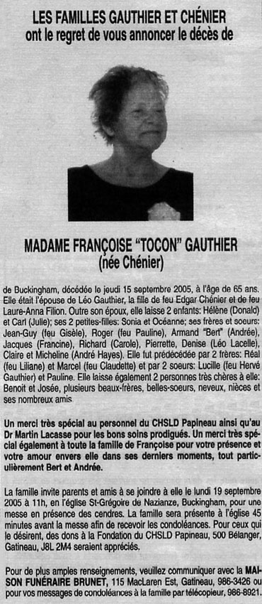 Gauthier, Françoise (Tocon) (Née Chénier) (1940-2005)