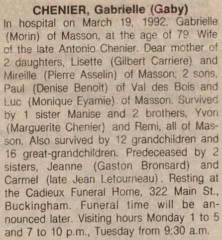 Chenier, Gabrielle (Gaby) (Née Morin) (1912-1992)
