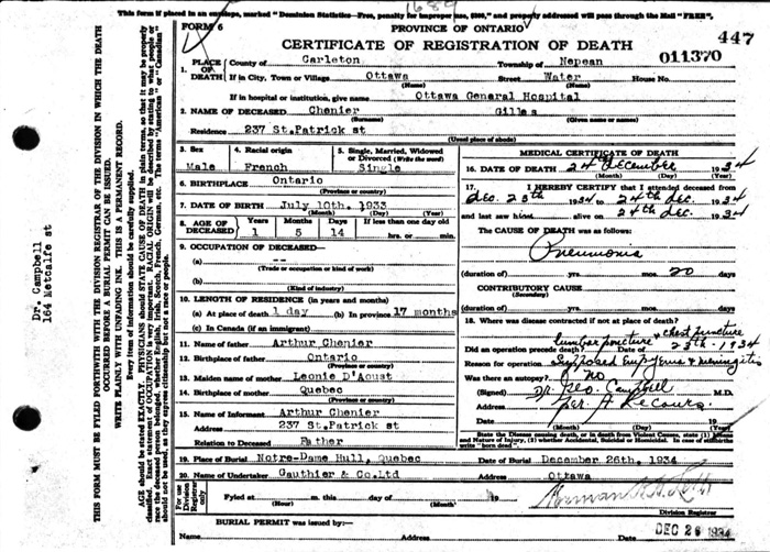 Chénier, Gilles (1933-1934) (Death Certificate)