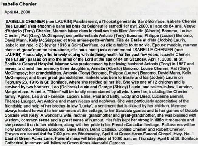 Chenier, Isabelle (Née Laurin) (1916-2000)
