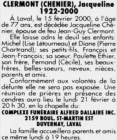 Clermont, Jacqueline (Née Chénier) (1923-2000)