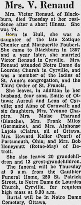 Renaud, Joséphine (Née Chénier) (1883-1957) (Ottawa Citizen Obit)
