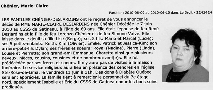 Desjardins, Marie-Claire (Née Chénier) (1941-2010)