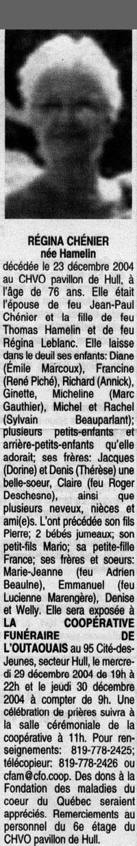 Chénier, Régina (Née Hamelin) (1929-2004)