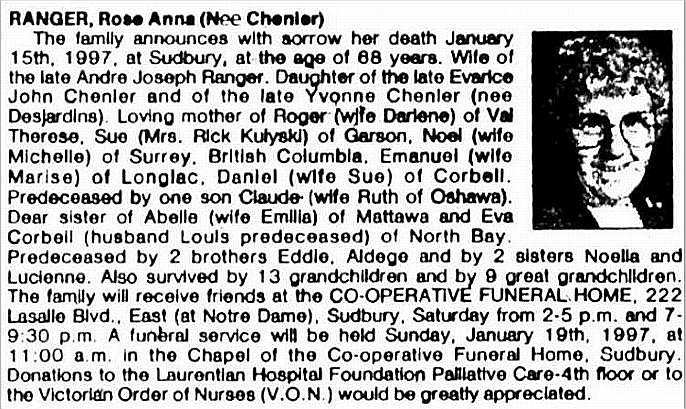 Ranger, Rose Anna (Née Chénier) (1927-1997)