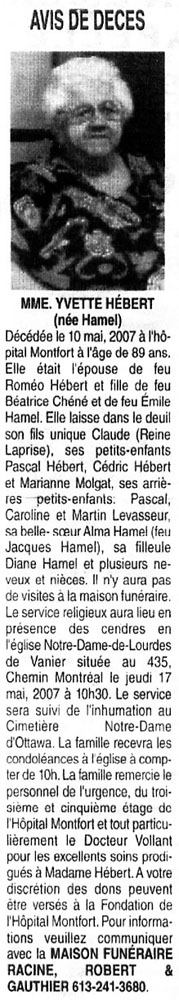 Hébert, Yvette (Née Hamel) (1918-2007)