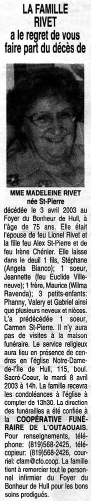 Rivet, Madeleine (Née St-Pierre) (1928-2003)