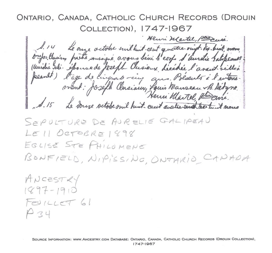 Death and burial record of Aurélie Galipeau in Bonfield, Ontario
