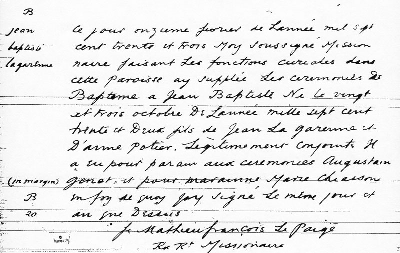 Record of baptism of Jean-Baptiste Lagarenne (Chesnay)