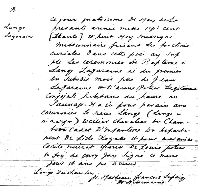 Record de baptême de L'Ange Lagarenne (Chesnay)