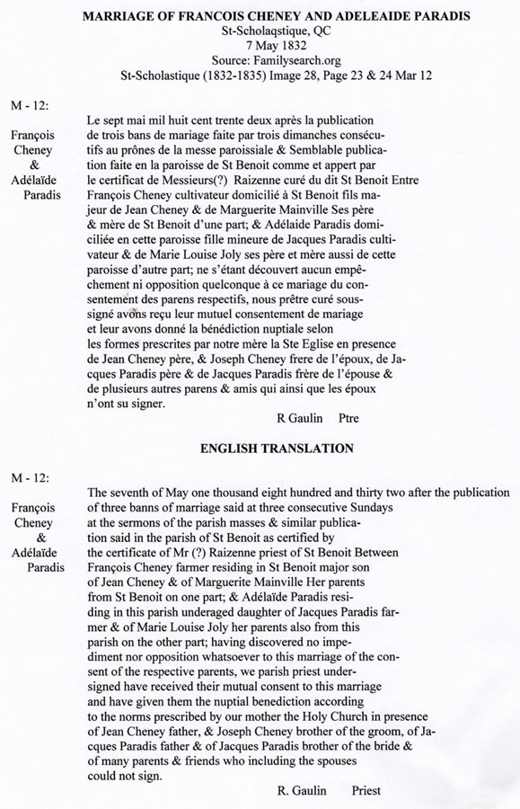 Marriage of François Cheney & Adélaïde Paradis: Transcription & Translation