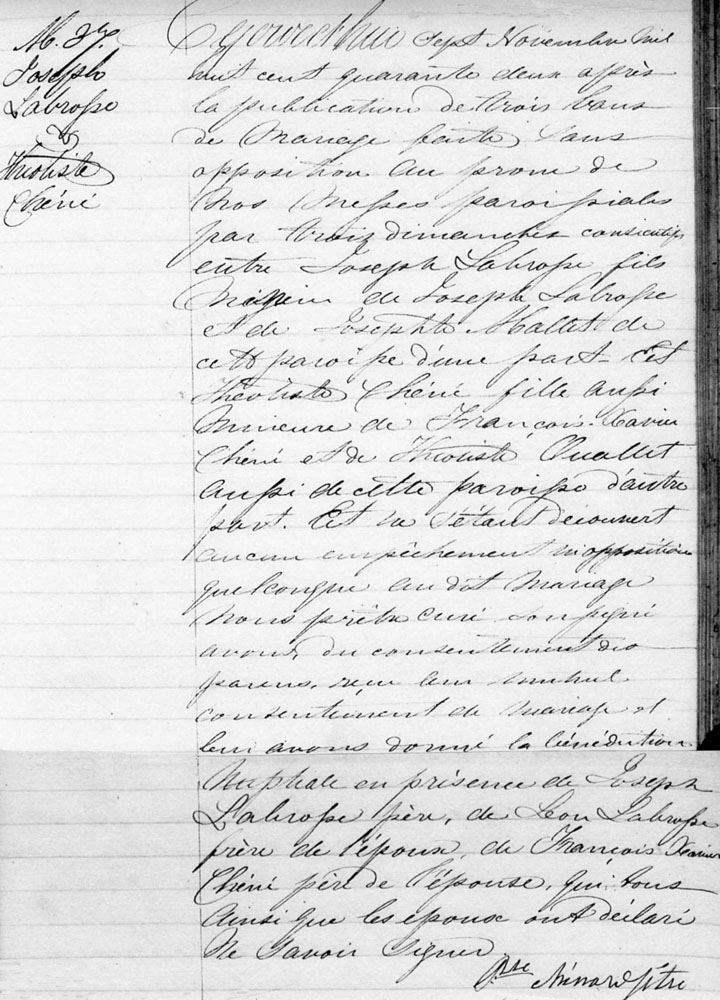 Marie Théotiste (Zéphirine) Chéné and Joseph Labrosse Marriage