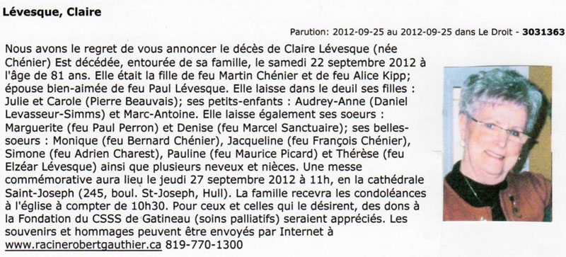 Lévesque, Claire (Née Chénier) (1931-2012)