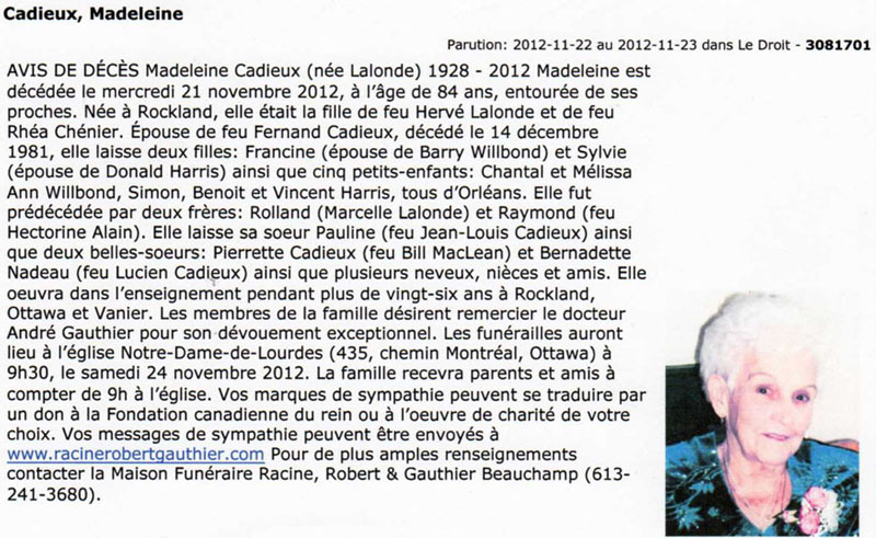 Cadieux, Madeleine (Née Lalonde) (1928-2012)