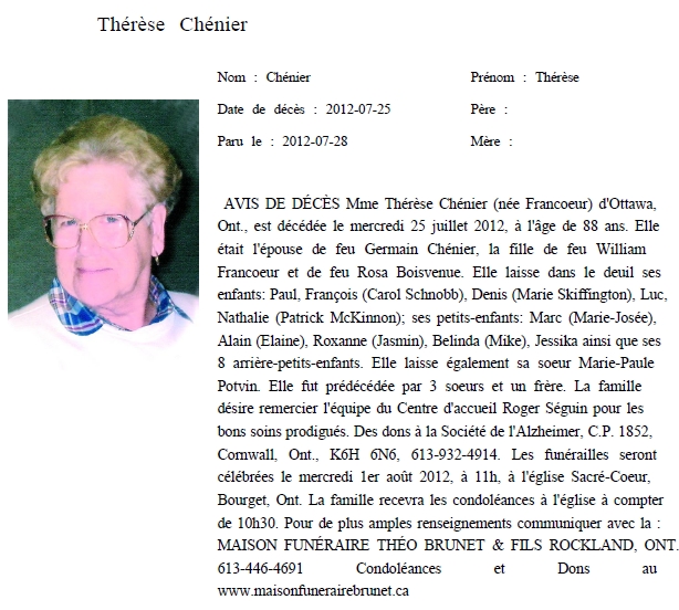 Chénier, Thérèse (Née Francoeur) (1924-2012)