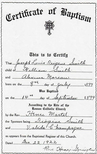Baptism Certificate for Joseph Louis Origène Smith
