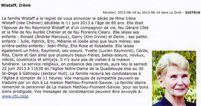 Wistaff, Irene (Née Chénier) (1933-2013)