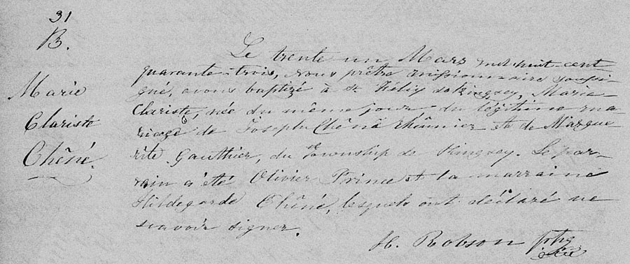 Bap. of/de Marie Clariste Chêné