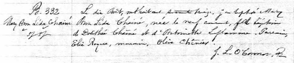 Record de baptême de Marie Anne Léda (Délia) Chainé