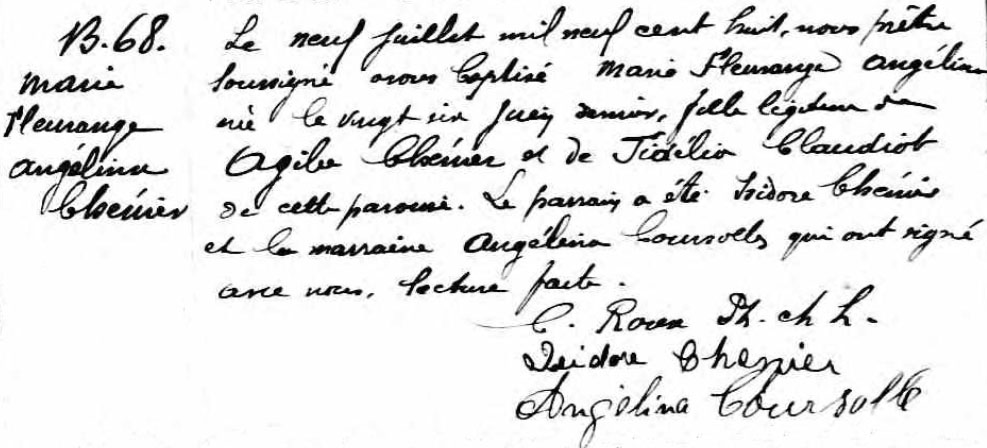 Record de naissanse et baptême de Fleurange Angélina Chénier à Gracefield, Québec