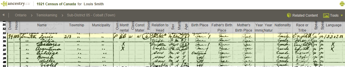 Enregistrement de la date approximative de la naissance de Walter Smith - Basé sur la copie du Recensement canadien 1921 de Cobalt, Ontario