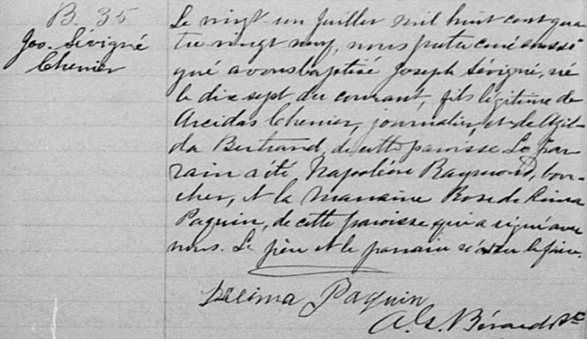 Baptism record for Joseph Sévigné Chénier