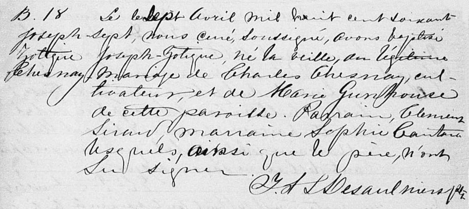 Baptism record of Joseph Zotique Chesnay