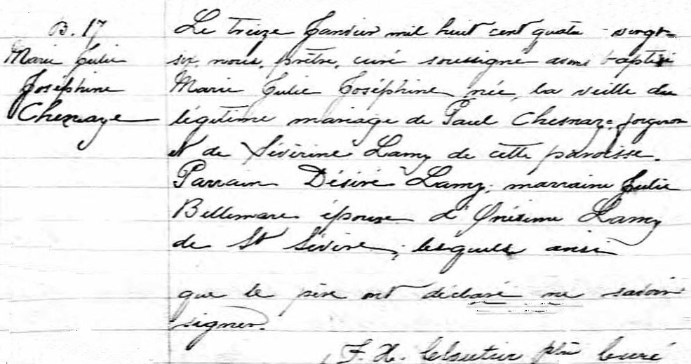 Baptism record of Marie Julie Joséphine Chesnay