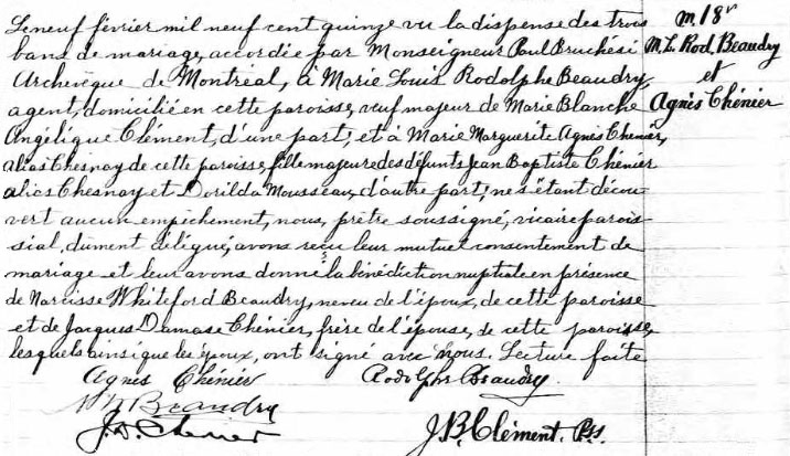 Marriage record for Marie Marguerite Agnès Chénier & Rodolphe Beaudry