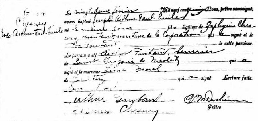 Record de baptême de Joseph Arthur Paul Emile Chesney