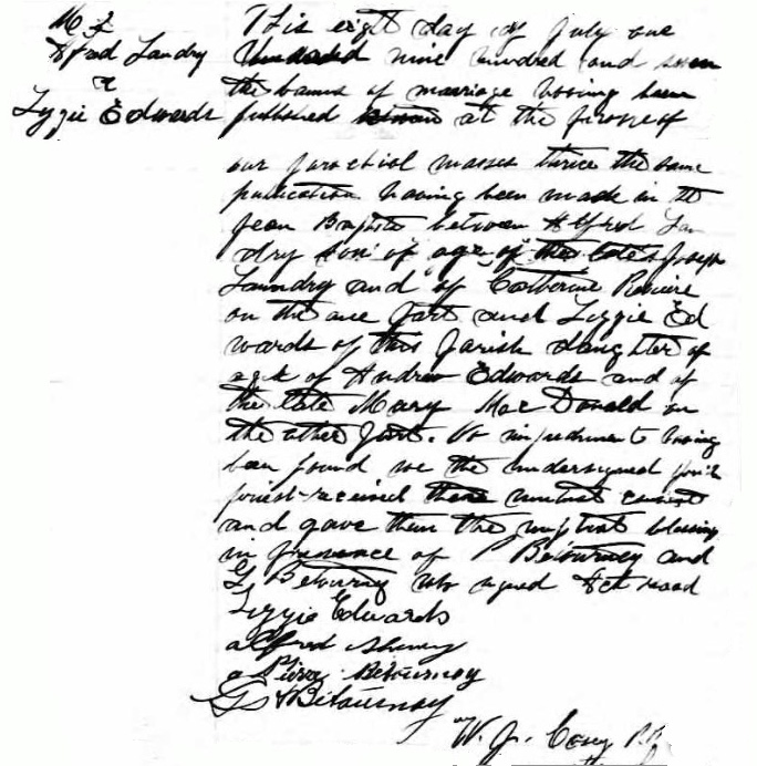 Record de mariage entre Frédéric (Alfred) Sheney/Chénier & Lizzie Edwards