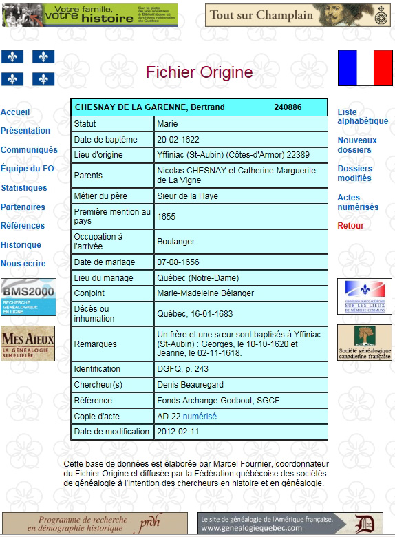 THE DESCENDANTS OF BERTRAND CHESNAY dit LAGARENNE