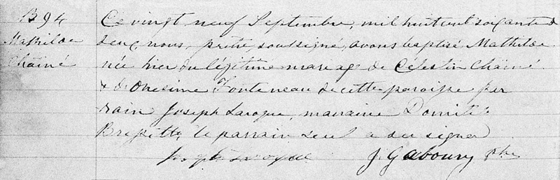 Baptism record for Mathilde Chainé
