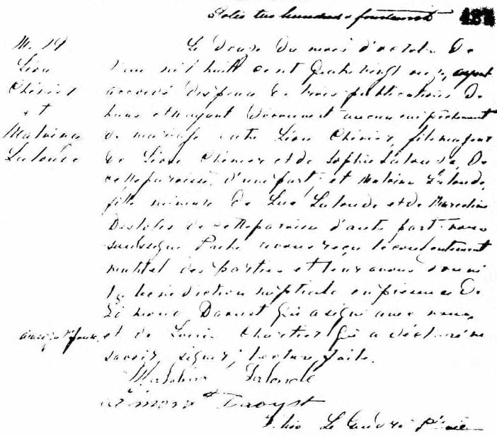 Marriage record between Léon Chénier and Malvina Lalonde