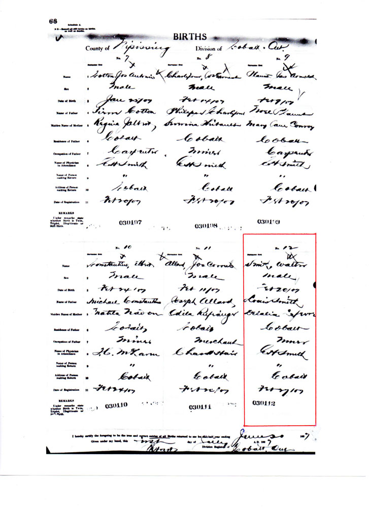 Birth record of first Walter Smith