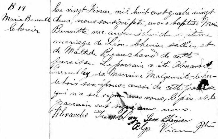 Baptism record for Marie Benoite Chénier