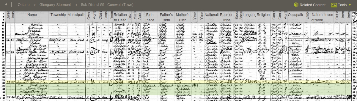 1921 Canadian Census of Cornwall, Ontarion