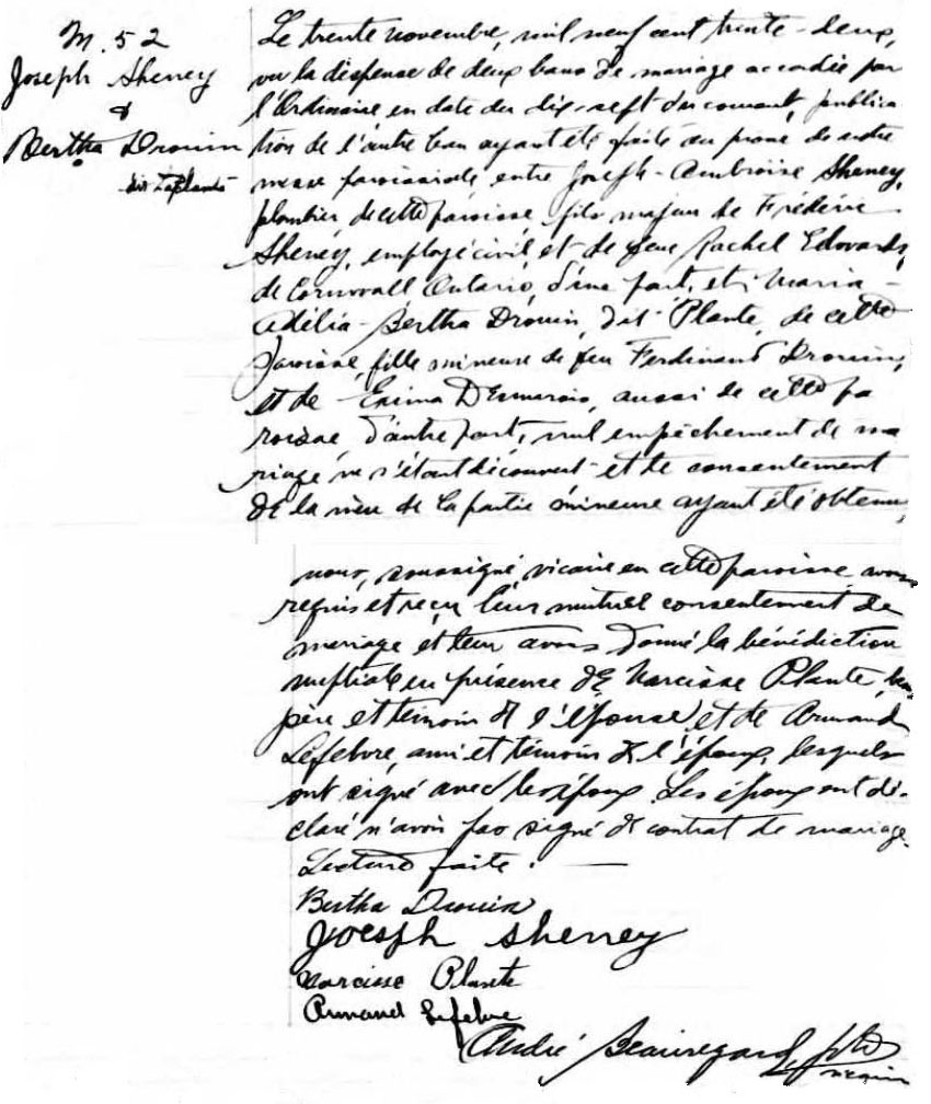 Copie du mariage de Joseph Sheney et Bertha Drouin-Plante