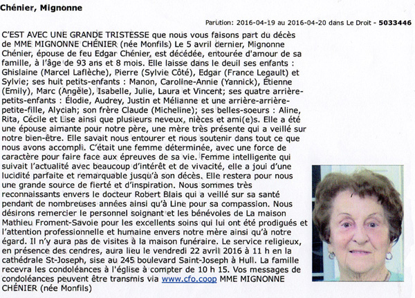 Chénier Mignonne (Née Monfils) (1922-2016)