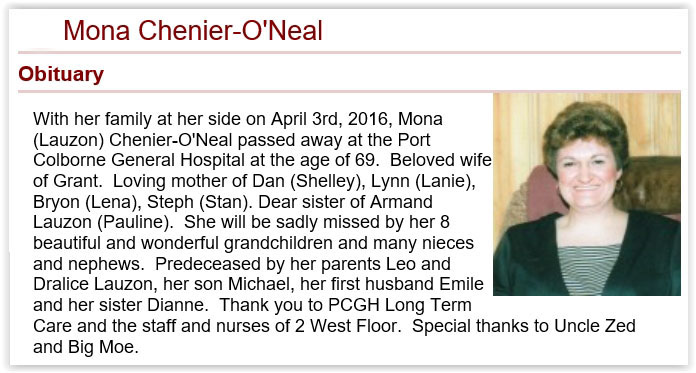 Chénier-O'Neal, Mona (Née Lauzon) (1947-2016)